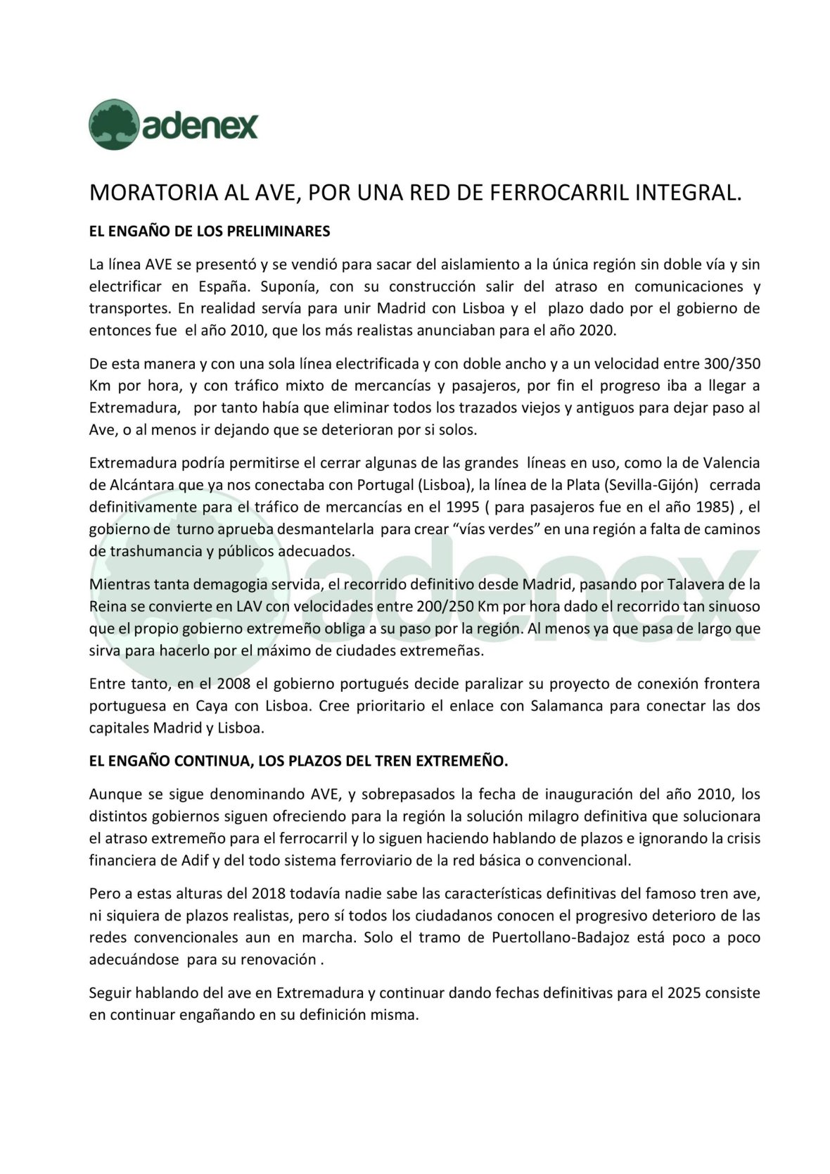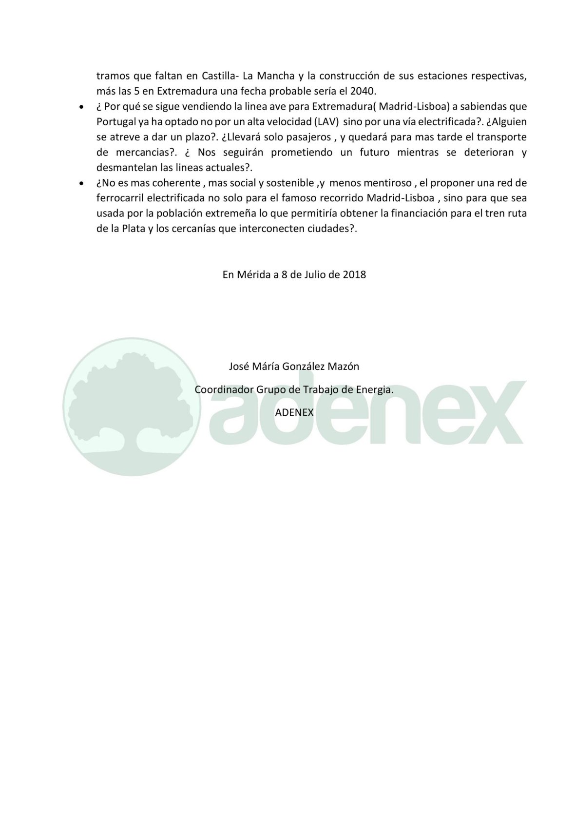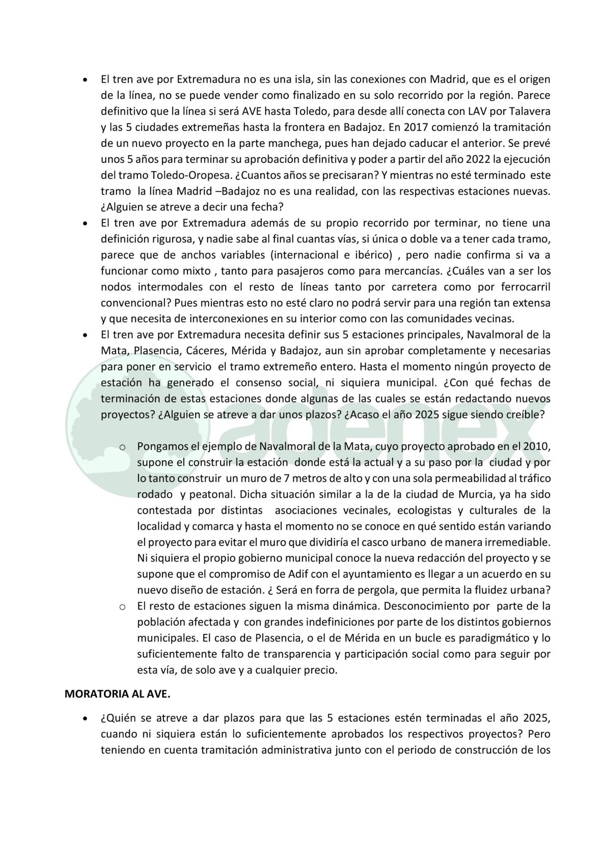 o El resto de estaciones siguen la misma dinámica. Desconocimiento por parte de la población afectada y con grandes indefiniciones por parte de los distintos gobiernos municipales. El caso de Plasencia, o el de Mérida en un bucle es paradigmático y lo suficientemente falto de transparencia y participación social como para seguir por esta vía, de solo ave y a cualquier precio.