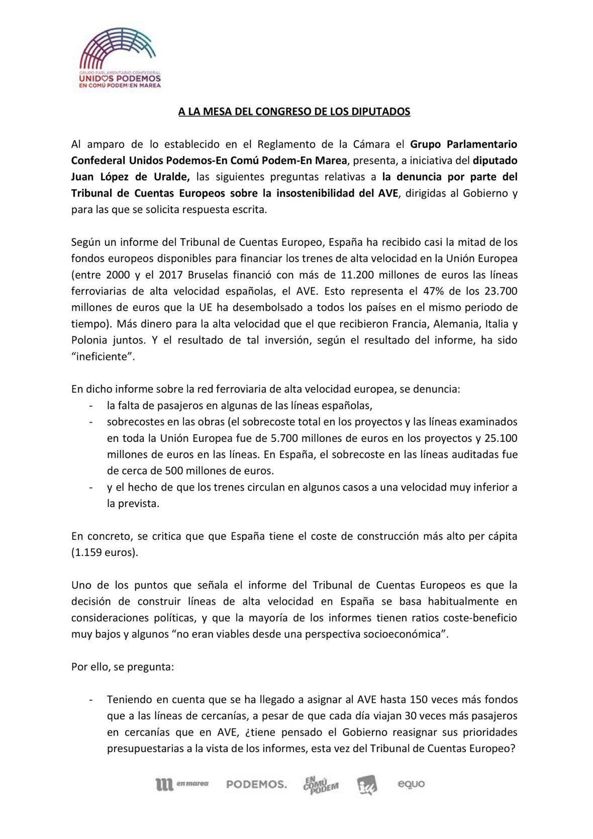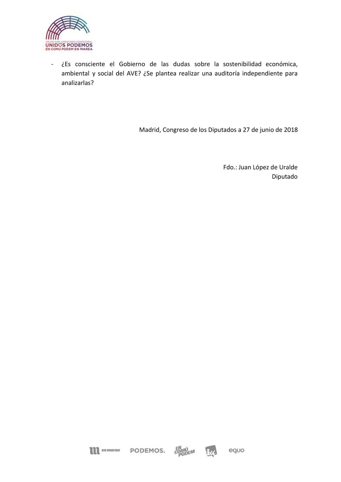 En concreto, se critica que que España tiene el coste de construcción más alto per cápita (1.159 euros). Sin embargo, desde los sucesivos Gobiernos se ha venido apostando únicamente por la alta velocidad, lo que deja la corta y media distancia en un segundo plano, sin recibir inversiones de mejora. Vistos los resultados, nuestro coportavoz Juantxo López de Uralde ha preguntado: ¿Tiene pensado el Gobierno reasignar sus prioridades presupuestarias? ¿Es consciente el Gobierno de las dudas sobre la sostenibilidad económica, ambiental y social del AVE? ¿Se plantea realizar una auditoría independiente para analizarlas?