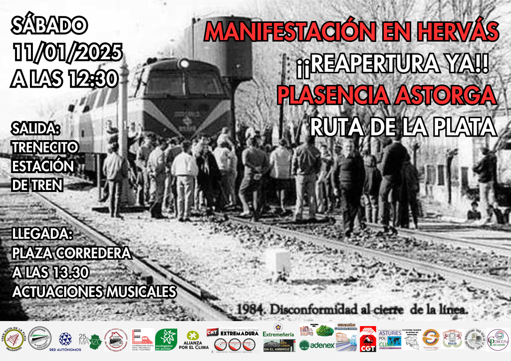 En HERVÁS, próximo 11 de enero, volveremos a manifestarnos por la recuperación de los servicios entre Sevilla y Gijón, exigiendo la REAPERTURA entre Plasencia y Astorga. La manifestación saldrá de la Estación de Ferrocarril de Hervás a las 13:30 h, llevaremos desde allí el trenecito de la Plaza hasta la Plaza de la Corredera, donde el Ayuntamiento de Hervás ha montado un escenario para que puedan actuar los cantautores extremeños Matías Simón y Fernando Triviño; que han compuesto canciones y/o himnos alusivas a la reivindicación de la Ruta de la Plata. También habrá micro abierto para que puedan hablar las personas que fueron testigos del cierre en 1984; protagonizando las manifestaciones que hemos podido ver en varios medios estos días.