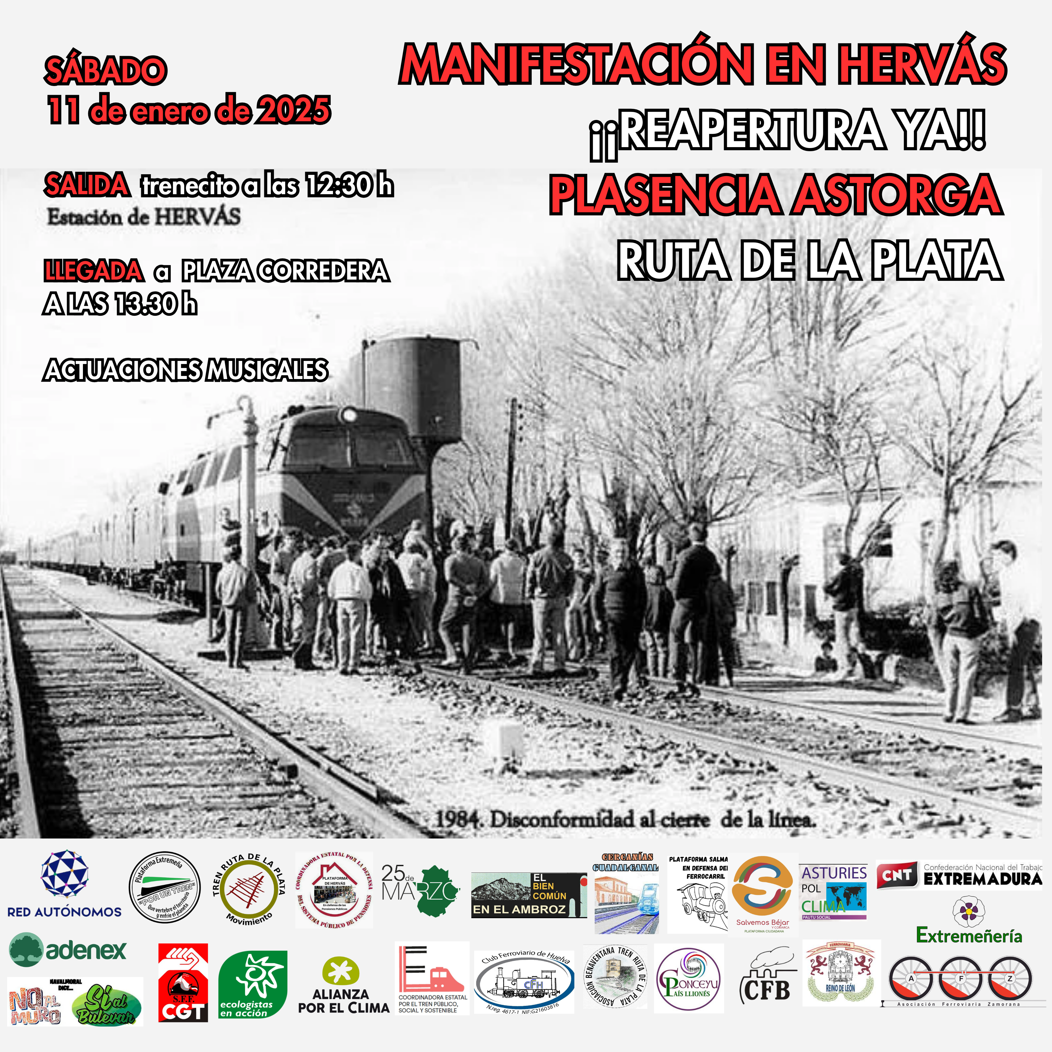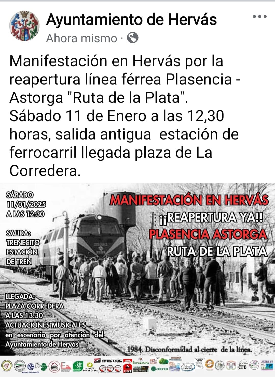 En HERVÁS, próximo 11 de enero, volveremos a manifestarnos por la recuperación de los servicios entre Sevilla y Gijón, exigiendo la REAPERTURA entre Plasencia y Astorga. La manifestación saldrá de la Estación de Ferrocarril de Hervás a las 13:30 h, llevaremos desde allí el trenecito de la Plaza hasta la Plaza de la Corredera, donde el Ayuntamiento de Hervás ha montado un escenario para que puedan actuar los cantautores extremeños Matías Simón y Fernando Triviño; que han compuesto canciones y/o himnos alusivas a la reivindicación de la Ruta de la Plata. También habrá micro abierto para que puedan hablar las personas que fueron testigos del cierre en 1984; protagonizando las manifestaciones que hemos podido ver en varios medios estos días.